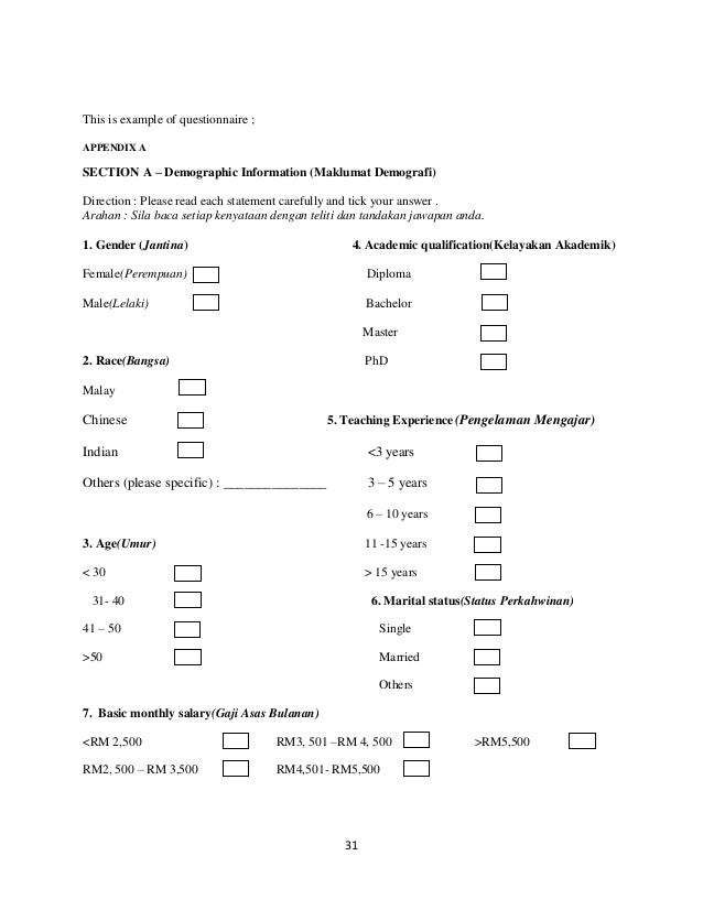 Use of questionnaire in field research offers various advantages. Questionnaire design is a very crucial and important part of the research because an inappropriate questionnaire misleads the research, academics, and policymaking. Research questionnaires gather the necessary data needed for a research study. If the area of research is sensitive or confidential in nature, designing questionnaire for such area is an hefty task. First of all, thank you for your interest to participate in this study in which your participation highly represents a valuable contribution to this research. They also save time, for both parties, as customers can fill it quickly on their own time and employees don't have to take time out of their days to sit in on interviews. Questionnaires—a predefined series of questions used to collect information from individuals. These types of questionnaires must be designed in various different manner depending upon the type of research which is conducted. January 10, 2020january 4, 2020 by sagar aryal. Borang rec 1e / 2016 part e: Is the online writing service that offers custom written papers, including research papers, thesis papers, essays and others contoh questionnaire thesis uitm, highschool 5 paragraph essay example body para. Designing the questionnaire is complicated because. 5.1 the questionnaire 48 5.1.1 students'detail 48.