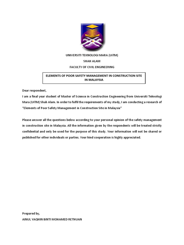 Contoh Questionnaire Research Uitm : Ethical issues questionnaire principal researcher :