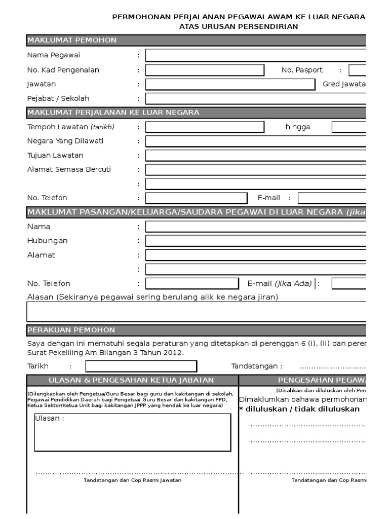 1.3 lawatan persendirian ke luar negara bermaksud lawatan yang dilakukan ke atas pilihan/tujuan peribadi pegawai sendiri ke luar negara. Permohonan lawatan ke luar negara atas urusan tidak rasmi persendirian mengikut surat pekeliling am bilangan 3 tahun 2012 unimas institutional repository. Contoh borang lawatan ke luar negara. Kemudahan perlindungan insurans kesihatan kepada pegawai perkhidmatan awam yang berada di luar negara/negara ketiga atas urusan persendirian telah dilaksanakan melalui pekeliling perkhidmatan bilangan 8 tahun 2004, surat edaran kit. Surat pekeliling am bilangan 3 tahun 2012 yang baru itu menetapkan semua pegawai awam yang ingin ke luar negara atas tujuan persendirian perlu mendapatkan kelulusan pegawai tinggi mengikut.