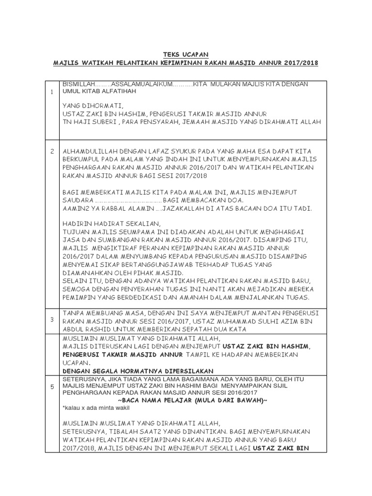Skrip Pengacara Majlis Mesyuarat Agung Pibg from imgv2-2-f.scribdassets.com Contoh teks ucapan pengacara majlis sempena hari guru. Sirih junjung berhias indah, sekacip pinang pembuka kata, bunga manggar kilau bercahaya, datang berkuunnjg ke majlis meriah, sejarah terukir nilai permata Bagi memastikan majlis berjalan dengan lancar, hadirin diingatkan agar mematikan atau memastikan telefon bimbit berada dalam pengaturcaraan senyap. Ucapan majlis persaraan kakitangan di bawah seliaan saya. Teks ucapan majlis penetapan target. Teks ucapandatuk haji hajiji haji noor,menteri kerajaan tempatan dan perumahan sempena meraikan majlisperpisahan puan p.s. Wong,pengurus besar, lppb,di shangri la's tanjung aru resortpada 2hb mei 2008 (jumaat)jam. Rombongan pengantin perempuan yang diraikan.